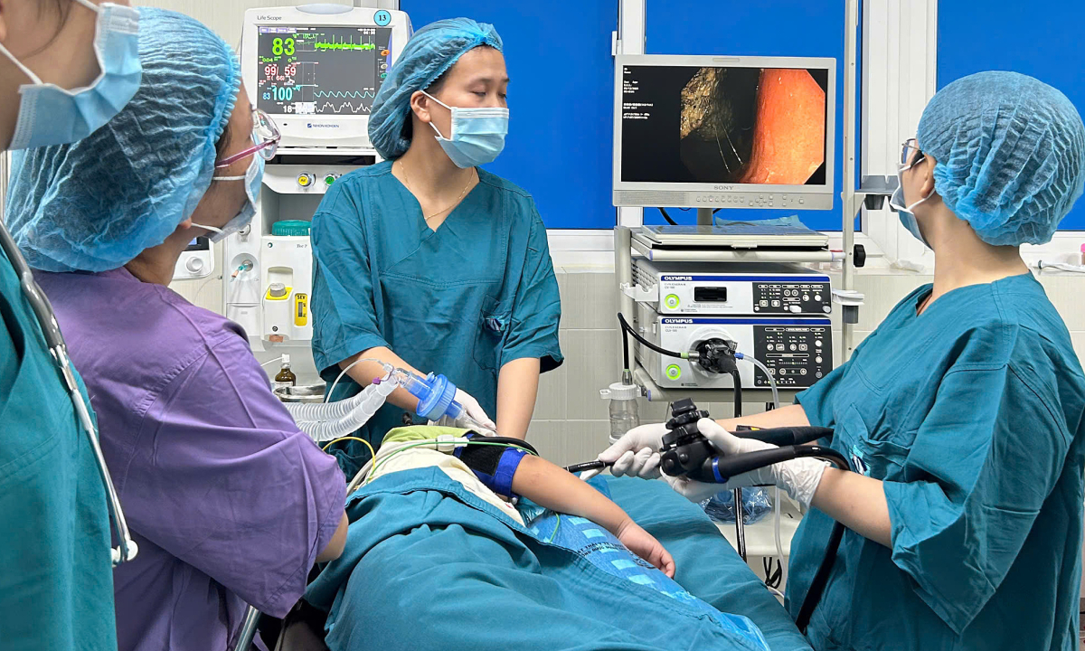 Êkíp y bác sĩ nội soi phát hiện búi tóc trong dạ dày bé. Ảnh: Bệnh viện cung cấp